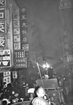1985年臺南帝王大飯店大火造成28死,縱火主嫌之一的陳東榮逃亡近25年落網。圖為案發當時救援場面。圖片來源:臺灣《中國時報》