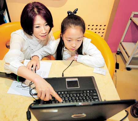 臺灣“婦援會”2日制作完成島內首創“關懷目睹家暴兒少兒童版網站”,島內藝人李翊君(左起)指導女兒香奈兒使用網站功能。圖片來源:臺灣《中國時報》