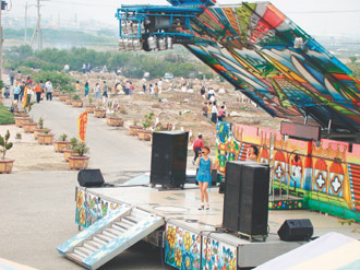 大型電子琴花車昨天下午停在嘉義縣東石鄉第四公墓納骨塔旁,穿著清涼的主持人說了幾句清明節祝福話,接著介紹表演女郎上臺,穿著藍色薄紗的女郎扭腰擺臀唱了兩首歌,隨即脫掉薄紗外套,露出比基尼舞臺裝繼續表演。