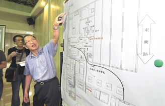 警方公布黑道角頭槍擊案相關錄像畫面,圖為臺中市第一分局刑警隊隊長楊春賢說明命案發生時,四名官警在場位置與歹徒槍殺時相關示意圖。圖片來源:聯合報