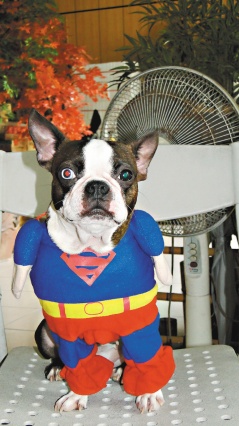 寵物狗“大目仔”愛穿超人裝。圖片來源:聯合報