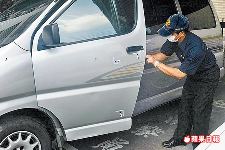 臺(tái)南警方偵防車(chē)被歹徒劫走,警察開(kāi)槍圍捕,子彈貫穿偵防車(chē)車(chē)門(mén)。 來(lái)源:臺(tái)灣《蘋(píng)果日?qǐng)?bào)》