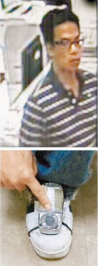 何嫌犯(上圖)將手機設定錄像功能,放到鞋帶內綁好固定(下圖),隨機挑選女子偷拍裙底風光。