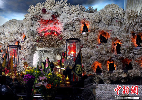 進入7月中下旬的臺灣富福頂山寺游客大增。這座寺廟位于三芝鄉橫山山上,據說是一位信徒從1996年起用上百種珊瑚與六萬多種貝殼堆砌而成,故又稱貝殼廟。此廟主奉祀濟公活佛和十八羅漢與圣母娘娘。廟堂建筑特別,色彩斑斕,猶如“海底世界”,慕名而來的香客游人絡繹不絕,香火旺盛。中新社發 宋吉河 攝