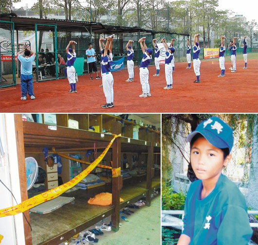 南投縣中興初中青少棒隊(duì)員蔡祥龍(右下圖),前天深夜在寢室(左下圖)跪坐在下鋪床板,以紅色尼龍布繩繞頸身亡。上圖為中興棒球隊(duì)之前練習(xí)的情形。(圖:臺灣《聯(lián)合報》)