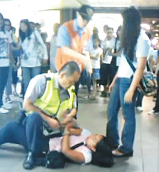 臺北市一名男警察在臺北車站查緝時,跨坐在印尼籍女子身上許久,引起大批民眾圍觀、議論紛紛。 來源:臺灣《聯合報》