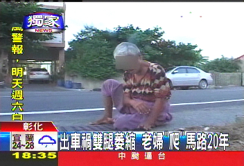 記者在彰化芳苑的大馬路邊,發現3、4只野狗圍著一個頭發斑白的老婆婆,她想閃躲,但似乎有困難,因為老婆婆的腳嚴重萎縮,只能用爬的,而且一爬就是20多年。每天出門,老婆婆就在馬路上爬,旁邊車子一臺臺呼嘯而過,記者看了都替她捏把冷汗。
