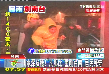 據報道,臺南縣受災較為嚴重,水深及腰。消防隊只得出動救生小艇,換上蛙人裝深入災區。但臺南縣的一些居民覺得自己住的高,消防隊員好說歹說,也不肯搬家。被撤出的災民中,有驚魂未定的一家5口。爸爸拿著值錢的家當,媽媽抱著強褓中的嬰兒,看著熟睡的孩子擦拭著眼淚。她表示,自己又回想起了“88水災”(2009年8月6日至8月10,臺風“莫拉克”侵襲臺灣,造成500多人死亡),她的好幾個親人在那次水災中死去。