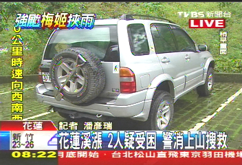 據報道,花蓮消防局昨日獲報,4名游客15日申請入山,在砂卡礑溪對岸扎營,因溪水暴漲被困山上,手機和無線電已成斷訊狀況,因此無法確定位置。救難人員今日再次入山搜救,隔著河岸只看到帳棚,懷疑4人失蹤。而疑似失蹤車主所有的銀色休旅車也一直停在停車場,無人領車。