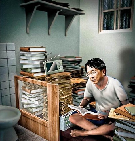 陳水扁牢房內堆滿文件,他抱怨房內空間越來越小。圖片來源:臺灣蘋果日報