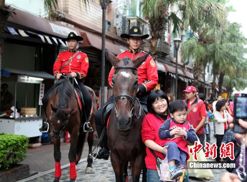 11月3日,每逢節假日,在臺北縣的旅游點鶯歌鎮,穿著紅色牛仔服的臺北縣警察局騎警,總是能吸引游客爭著與其拍照。 中新社發 記者 陳立宇 攝