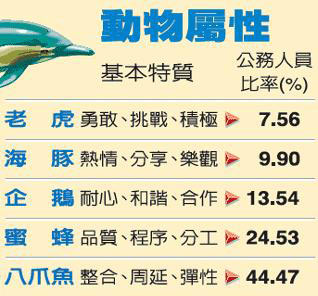 職能評鑒系統以老虎、海豚、企鵝、蜜蜂、八爪魚等五種動物屬性,代表五種公務員的人格特質;但這些動物特質與一般民眾的刻板印象不同,都是屬于比較正面的價值。結果是八爪魚最多,占四成四,其次是蜜蜂,近兩成五,企鵝近一成四,老虎或海豚最少,均不及一成。