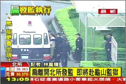報道稱,陳水扁的囚車在離開臺北看守所時,在外守候的部分陳水扁支持者大喊陳水扁無罪,陳水扁支持者還一度接近想包圍車輛,上百警員戒備。今日下午1時左右,陳水扁在大批警力車隊戒護下,由臺北看守所移至桃園龜山的臺北監獄。約1時37分左右,抵達臺北監獄。