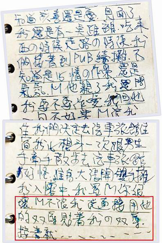 報道稱,該女子在筆記本中記載了她與美籍華裔男子的性愛過程,其中寫到:“要不要性愛”、“內心好快樂,好希望時間停住,也決定去汽車旅館”、“進房大張開雙手擁我入懷,我罵M你很壞,M不讓我說,直接用他的雙唇貼著我的雙唇,接著就……”等露骨語句;且她還被丈夫查到寄內衣褲給情夫的郵遞收據,另外一名香港男子也坦承和沈女發生過性關系。