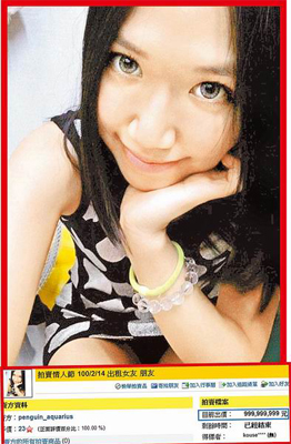 賬號(hào)“水瓶座企鵝”的網(wǎng)友在拍賣網(wǎng)站上張貼了一張大眼美女照,拍賣“出租女友”,最后以近10億元天價(jià)結(jié)標(biāo)(藍(lán)框處)。 來(lái)源:臺(tái)灣媒體