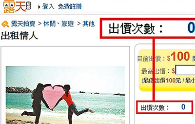 有網(wǎng)友在拍賣網(wǎng)站以100元起標(biāo),在情人節(jié)當(dāng)天拍賣自己充當(dāng)情人,但無(wú)人出價(jià)(紅框處)。來(lái)源:臺(tái)灣媒體