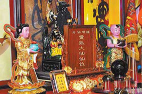 靈狐大仙仙位左有桃花仙子,右有招財(cái)童子,據(jù)稱拜了可以旺人緣、桃花。圖片來(lái)源:臺(tái)灣媒體
