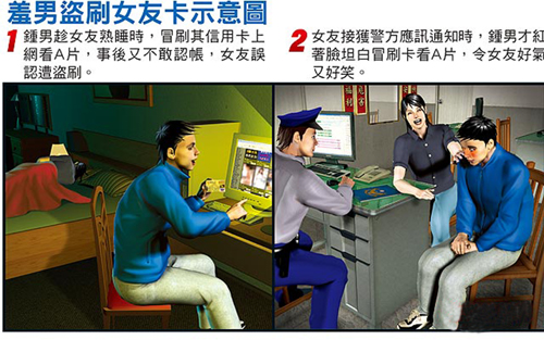 據臺灣媒體報道,上月13日凌晨4時許,鐘姓男子睡不著上境外色情網站欲看影片,但因須刷卡付費才能看,他沒有信用卡,心想女友的信用卡費,都是他在埋單,而從女友皮包中取出信用卡偷刷500多元新臺幣后放回,以為不會被女友發現。