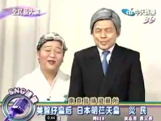 據(jù)報道,當(dāng)日節(jié)目是模仿明仁天皇夫婦至東京武道館時,屈膝跪在榻榻米上向災(zāi)民慰問的景況,由阿KEN、納豆分別飾演“明芢天皇”及“美智仔皇后”;他們在簡單的問候之后,即開始演出下跪戲碼,阿KEN還搞笑地在半蹲后迅速“彈起”,展現(xiàn)“明芢天皇”的矯健身手。