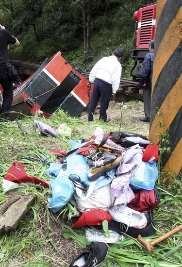 昨日,救援人員在臺灣阿里山小火車翻車事故現場