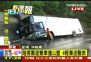 大陸游客團游覽車臺灣屏東縣發生車禍,4人送醫。圖片來源:臺灣TVBS電視臺