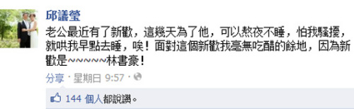 罹患卵巢癌、正在化療的的民進黨籍“立委”邱議瑩,12日在臉書PO文說,“老公最近有新歡,為了他可以熬夜晚睡,怕我騷擾,就哄我去睡。面對這個新歡,我毫無吃醋的余地,因為對象是林書豪”。有網友回應,NBA寡婦又一位;有網友安慰她要看開一點。