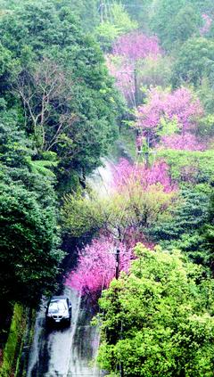 連續四天假期,全臺著名賞櫻景點一路塞塞塞,其實只要不隨著人群走,各地仍有不少私房賞櫻景點,如圖中這個烏來山上,成排櫻花樹,民眾可下車在細雨中漫步賞櫻。(圖片來自臺灣媒體)