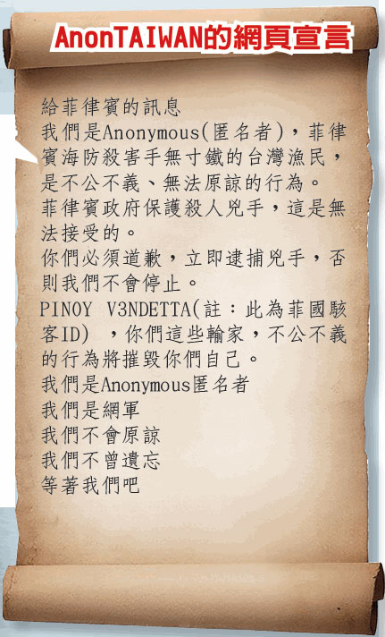 臺灣黑客群AnonTAIWAN的網(wǎng)頁宣言。(圖片來自臺灣《聯(lián)合晚報(bào)》)