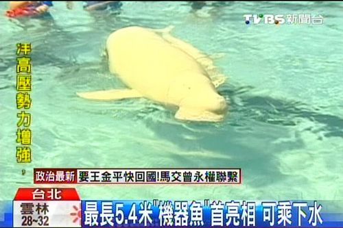 據臺灣TVBS網站報道,全球第一只長頸龍造型的“機器魚”首度亮相,上面還可以乘坐人,是日本來的海洋學家帶領臺灣的大學生共同制作,還有海豚、鯊魚、海龜等各種魚類,仿真度極高,而且都是運用塑料瓶等回收廢棄物作成的。