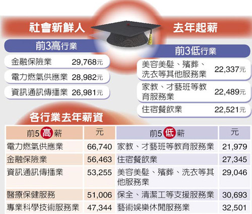 若以行業(yè)別來看,最有行情的社會新鮮人,首推金融保險業(yè),平均起薪29768元,電力及燃?xì)夤⿷?yīng)業(yè)居次,28982元,服務(wù)業(yè)的起薪相對則較低,僅22K、23K。