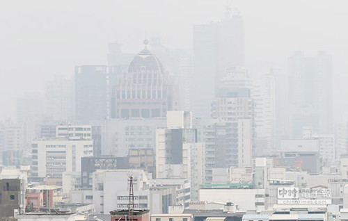 周末臺灣上空的氣壓等壓線稀疏、風力微弱,使污染物難以消散,遠眺臺中市區一片灰蒙蒙。(圖自臺灣“中時電子報”)