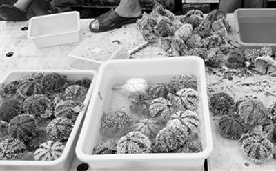 澎湖海膽采捕如期開放,5月16日清晨,馬公第三漁港可見攤販與漁民銷售,吸引不少游客和當地民眾搶頭香,現場搶鮮開挖裝盒,大的1顆賣70元(新臺幣),也有3顆賣100元的。 鐘 揚攝(中新社發)