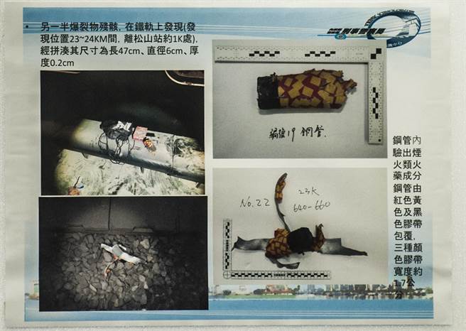 此外,鑒識人員也針對跡證報(bào)告指出,掉落在座位上和車體外的爆裂物,上面都有黑色膠帶包覆著紅色膠帶,最外面還有黃色塊狀膠帶。兩部分的鋼管合起來約有47厘米,可以裝填火藥量500至1000克。