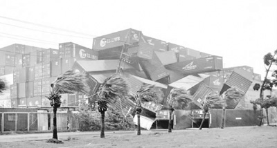 圖為“莫蘭蒂”強臺風橫掃高雄,高雄港碼頭邊堆置的數十個貨柜,被強風吹得東倒西歪。(圖片來自聯合報)