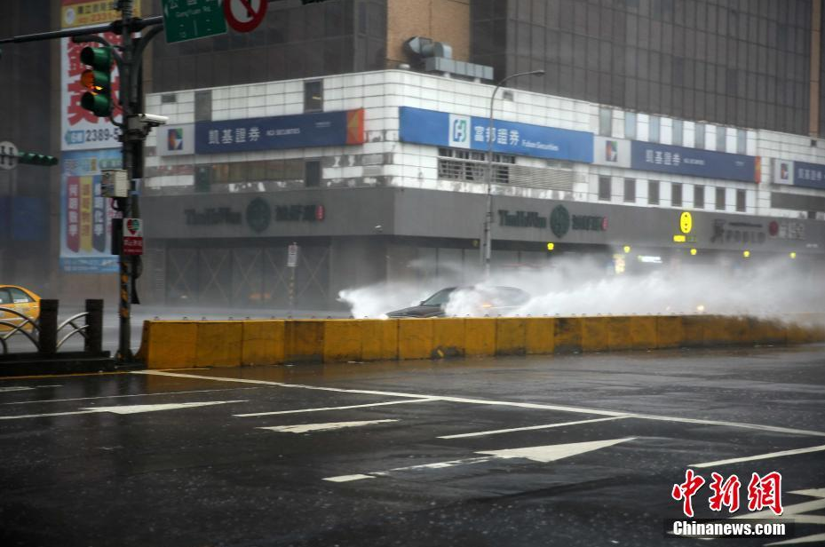 9月27日,“鲇魚”臺風橫掃臺灣,強風暴雨造成樹倒車翻,造成人員死傷。據臺灣災害應變中心統計,至27日晚上8時,臺風造成4死268傷。圖為臺北車站前大街汽車駛過,濺起一人多高的浪花。中新社記者 黃少華 攝