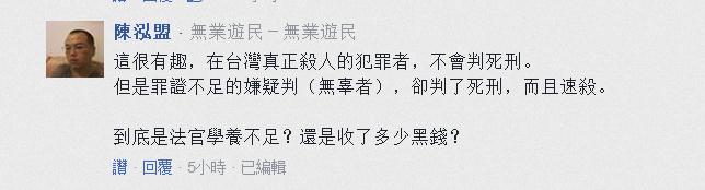 “這很有趣,在臺灣真正殺人的犯罪者,不會判死刑。但是罪證不足的嫌疑判(無辜者),卻判了死刑,而且速殺。到底是法官學養不足?還是收了多少黑錢?”
