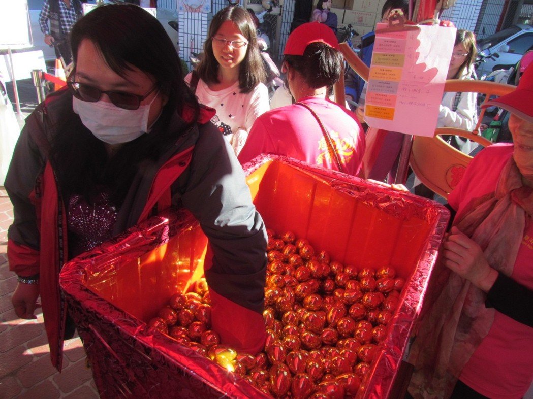 紫南宮大年初一發(fā)“錢母”,信眾興奮地抽金雞蛋。(圖片來源:臺灣《聯(lián)合報》)