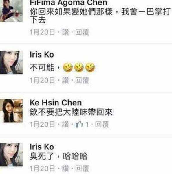據(jù)臺(tái)灣“聯(lián)合新聞網(wǎng)”12日?qǐng)?bào)道,這名“臉譜”名為Iris Ko的臺(tái)灣女子,被所在公司廈門美萊醫(yī)療確認(rèn)叫作陳可晴。她在“臉譜”中與朋友對(duì)話,花式辱罵大陸人,像是“臭死了”、“俗爆了”、 “很難搞”。