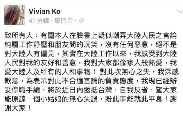 據(jù)了解,該臺(tái)灣女子已將“臉譜”內(nèi)容刪除,并改名為 Vivian Ko,隨后更新了一條致歉聲明,聲稱,不當(dāng)言論是無惡意的玩笑,“希望大家能夠原諒一個(gè)小姑娘的無心之失”。