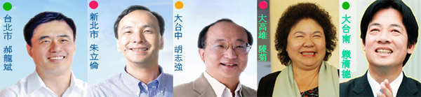 臺灣11月27日進(jìn)行了2010年五市(臺北市、新北市、大臺中市、大臺南市、大高雄市)市長選舉。從目前得票結(jié)果來看,國民黨提名參選人獲得了臺北市、新北市、大臺中市三市市長職位,民進(jìn)黨提名參選人確定贏得大高雄市、大臺南市兩市市長職位。 【詳細(xì)】