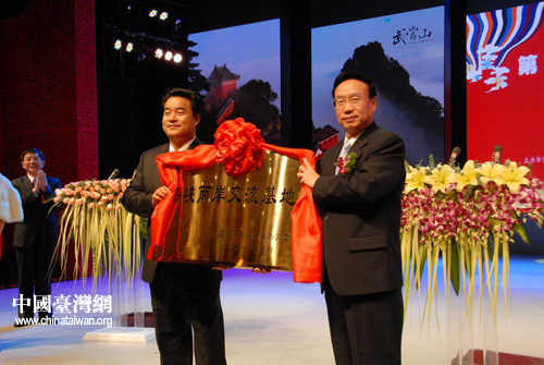 授牌儀式上,李亞飛向武當(dāng)山特區(qū)工委書記、管委會(huì)主任李發(fā)平授于“武當(dāng)山海峽兩岸交流基地”的牌匾。這是繼山東省棗莊市臺(tái)兒莊之后全國(guó)第二個(gè)“兩岸交流基地”。隨后,在武當(dāng)山進(jìn)山大門口,中共中央臺(tái)辦、國(guó)務(wù)院臺(tái)辦主任助理、海協(xié)會(huì)執(zhí)行副會(huì)長(zhǎng)李亞飛和湖北省副省長(zhǎng)田承忠為海峽兩岸交流基地揭牌。
