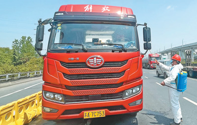 21日11時左右,記者在南京市雍莊交通樞紐見到郭輝時,他已做完核酸檢測和抗原檢測。防疫人員正拎著酒精壺對貨車實施全面消毒作業。丁健將5份介紹信交給卡口工作人員,工作人員核對后退還了暫留的駕駛證、行駛證,將郭輝駕駛的貨車放行。