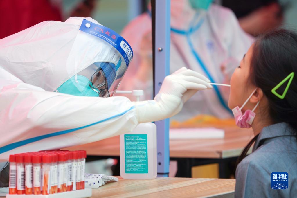 5月5日,在北京市朝陽區建外街道一處核酸檢測點,醫務人員為一名小朋友進行核酸采樣。新華社記者 鞠煥宗 攝
