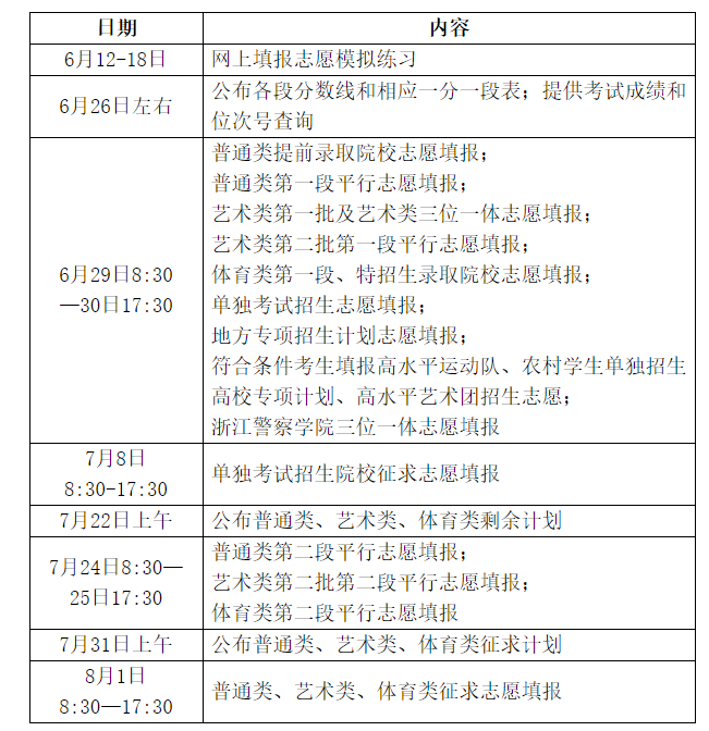 6月27日8時至7月1日17時,統考考生填報本科提前批志愿、特殊類型招生志愿、本科普通批志愿,單考考生填報職教師資班和高職單考單招志愿。