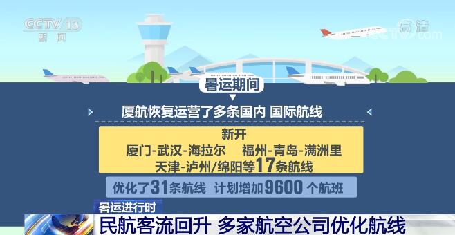 暑運期間,廈航恢復運營了多條國內、國際航線,新開廈門-武漢-海拉爾、福州-青島-滿洲里、天津-瀘州/綿陽等17條航線,優化了31條航線,計劃增加9600個航班。
