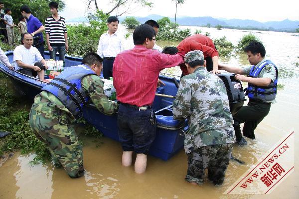 資料圖片:5月7日,廣東英德市人武部民兵緊急轉(zhuǎn)移群眾。自5日起,廣東突遭特大暴雨襲擊,局部地區(qū)發(fā)生洪災(zāi),北江支流滃江出現(xiàn)超30年一遇洪水,韶關(guān)、清遠(yuǎn)等市水情較重。 新華社發(fā)(李作描 攝)