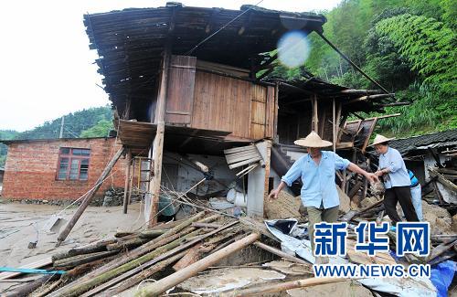 6月15日,居民在福建省南平市西芹鎮(zhèn)坑布村被山洪沖垮的房屋廢墟上尋找可用的物品。新華社記者魏培全攝