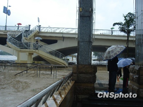 6月17日8時(shí)20分,桂林市氣象局發(fā)布暴雨紅色預(yù)警信號(hào):桂林市區(qū)預(yù)計(jì)3小時(shí)雨量將達(dá)100毫米以上,且降雨可能持續(xù)。10時(shí)39分,桂林市區(qū)段漓江水位達(dá)到146米,超過(guò)警戒水位0.3米,預(yù)計(jì)下午16時(shí),漓江水位將達(dá)到147.2米。圖為桂林市解放橋下不斷上漲的積水。 中新社發(fā) 歐惠蘭 攝