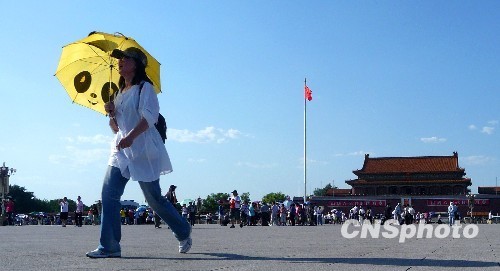 2010年7月5日,京城晴空萬里、驕陽似火。當(dāng)日北京市氣象臺(tái)發(fā)布高溫橙色預(yù)警:受暖氣團(tuán)影響,當(dāng)日下午北京市大部分地區(qū)最高氣溫升至37℃以上,城區(qū)氣溫可達(dá)39℃至40℃。 中新社發(fā) 玉龍 攝