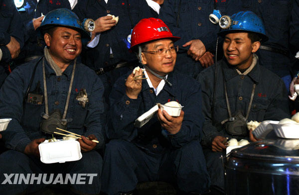 資料圖:2009年7月4日至5日,中共中央政治局常委、國務院總理溫家寶在山西考察。這是7月5日,溫家寶在同煤集團塔山礦井慰問煤礦工人并與他們共進午餐。新華社記者姚大偉攝